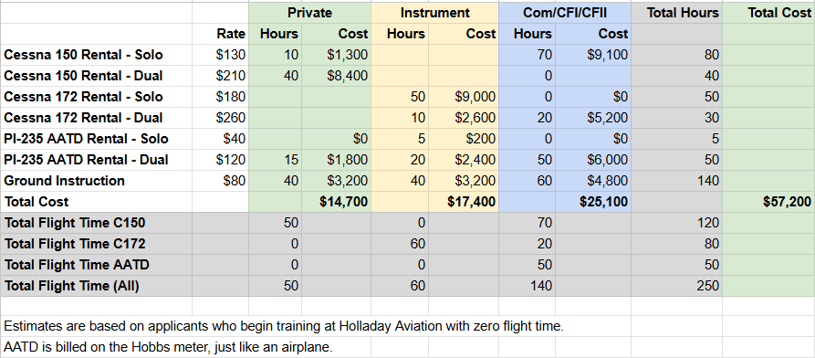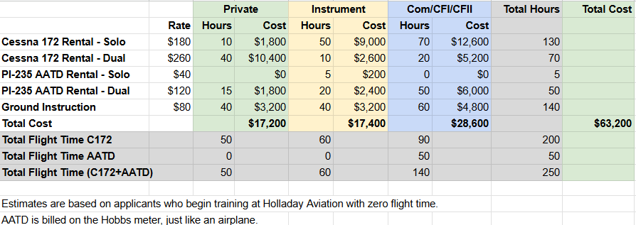 If your goal is to earn your commercial pilot and flight instructor certificates, you can expect to spend a total of about $60,000. That is a safe number for budgeting purposes and is a bit easier to estimate than the private pilot certificate. However, there are great ways to save time and money at every step along the way. We recommend incorporating the use of our PI-235 AATD flight simulator, which provides an excellent platform for skills development and retention. Students who invest more time practicing on the ground tend to require less practice in the airplane.